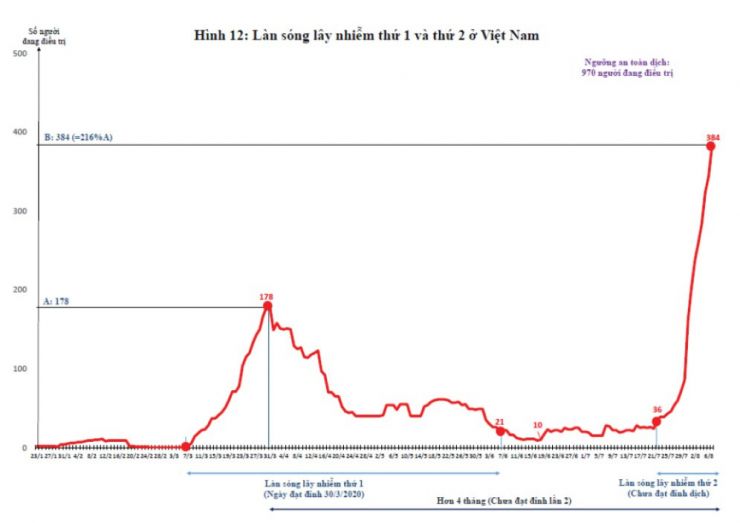 Với dân số 96,5 triệu người, ngưỡng an toàn dịch của Việt Nam là 970 người đang điều trị ở các bệnh viện. Cũng như Campuchia, từ khi có người mắc Covid-19 đầu tiên (ngày 23/01/2020), lúc cao nhất Việt Nam chỉ có 178 người mắc đang được điều trị (Hình 12), sau đó giảm dần. Tức là Việt Nam có làn sóng lây nhiễm thứ 1, đạt đỉnh ngày 30/3/2020, song chưa có dịch. Ngày 18/6/2020, cả nước chỉ còn 10 người mắc đang được điều trị tại các bệnh viện. Tuy nhiên, sau hơn 1 tháng, từ ngày 22/7/2020 số ca mắc mới đã tăng mạnh, ngày 7/8/2020 đã có 384 người đang được điều trị, gấp 2,16 lần đỉnh lây nhiễm của làn sóng thứ 1 (178 người - Hình 12). Việt Nam đã bước vào làn sóng lây nhiễm thứ 2. Sau 190 ngày có lây nhiễm Covid-19 mà không có người nào bị chết, chỉ 6 ngày, từ ngày 31/7 đến ngày 6/8/2020, đã có 10 người bị chết. Hiện nay chưa dự báo được khi nào thì làn sóng lây nhiễm Covid-19 lần thứ 2 ở Việt Nam đạt đỉnh. Với tổng số người đã mắc đến ngày 7/8/2020 là 789 người (Hình 12), ta thấy có khả năng khoảng từ ngày 15 - 20/8/2020 sẽ có 1.000 người mắc và khoảng 500 người nhiễm đang điều trị ở các bệnh viện. Tức là tổng số người đang được điều trị có nguy cơ gấp gần 3 lần đỉnh lây nhiễm của làn sóng thứ 1 (ngày 30/3/2020: 178 người đang điều trị) và 10 người chết, chỉ trong 7 ngày. Làn sóng lây nhiễm Covid-19 lần thứ 2 ở Việt Nam có thể nghiêm trọng hơn lần thứ 1 rất nhiều (178 người mắc đang được điều trị, không có người chết - Hình 12).
