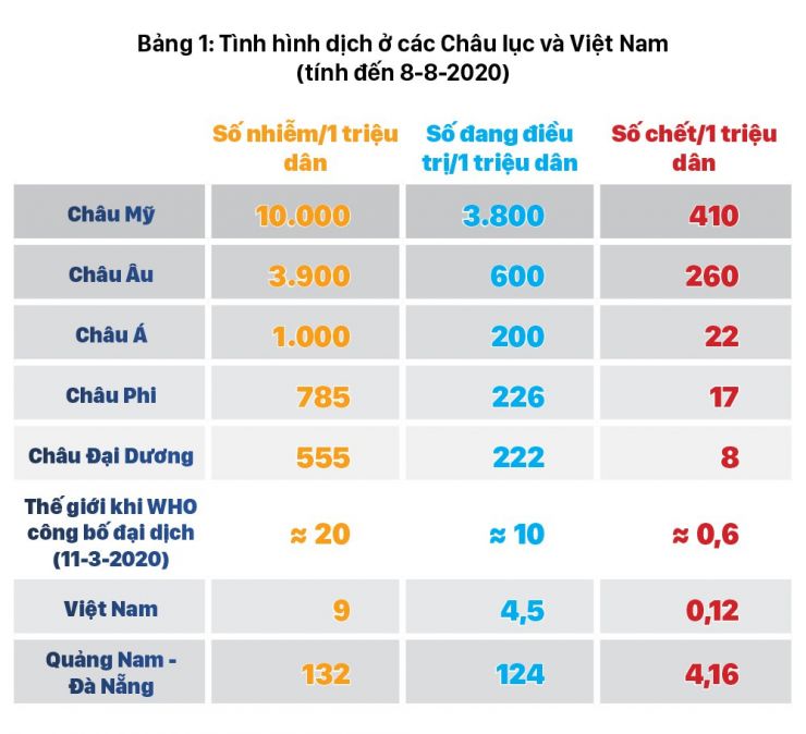 Qua Bảng 1 ta thấy, mức độ lây nhiễm trong cộng đồng ở Việt Nam là 9 người/1 triệu dân, chưa bằng 1/2 mức lây nhiễm khi Tổ chức Y tế Thế giới công bố đại dịch toàn cầu ngày 11/3/2020, còn so với các Châu lục khác, từ 550 người/1 triệu dân đến 10.000/1 triệu dân thì quá nhỏ bé.