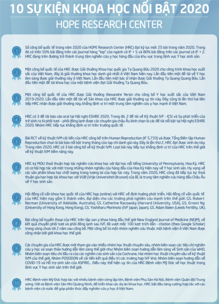 Điều gây ấn tượng thứ ba chính là các sản phẩm khoa học của HRC. Trong năm 2020, HRC có 20 công bố quốc tế trên các tập san chuyên ngành (danh sách đính kèm), bao gồm: 3 đề tài về Sản Phụ khoa; 17 đề tài về hiếm muộn – vô sinh; trong đó, 15 đề tài là do các nghiên cứu viên của HRC đứng tên “first author” hay “last author”. Một đề tài của HRC về Sản Phụ khoa về đánh giá hiệu quả của vòng nâng tử cung so với progesterone âm đạo trong dự phòng sinh non trên thai phụ song thai đã đạt giải thưởng Alexandre Yersin do Lãnh sự quán Thuỵ Sỹ và Hội HELVIETMED trao tặng. Đây cũng là lần thứ hai liên tiếp HRC đạt được giải thưởng này.