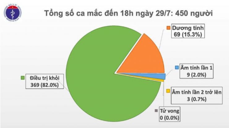 - Tính đến 18h ngày 29/7: Việt Nam có tổng cộng 450 ca mắc COVID-19, trong đó 276 ca nhiễm nhập cảnh được cách ly ngay.