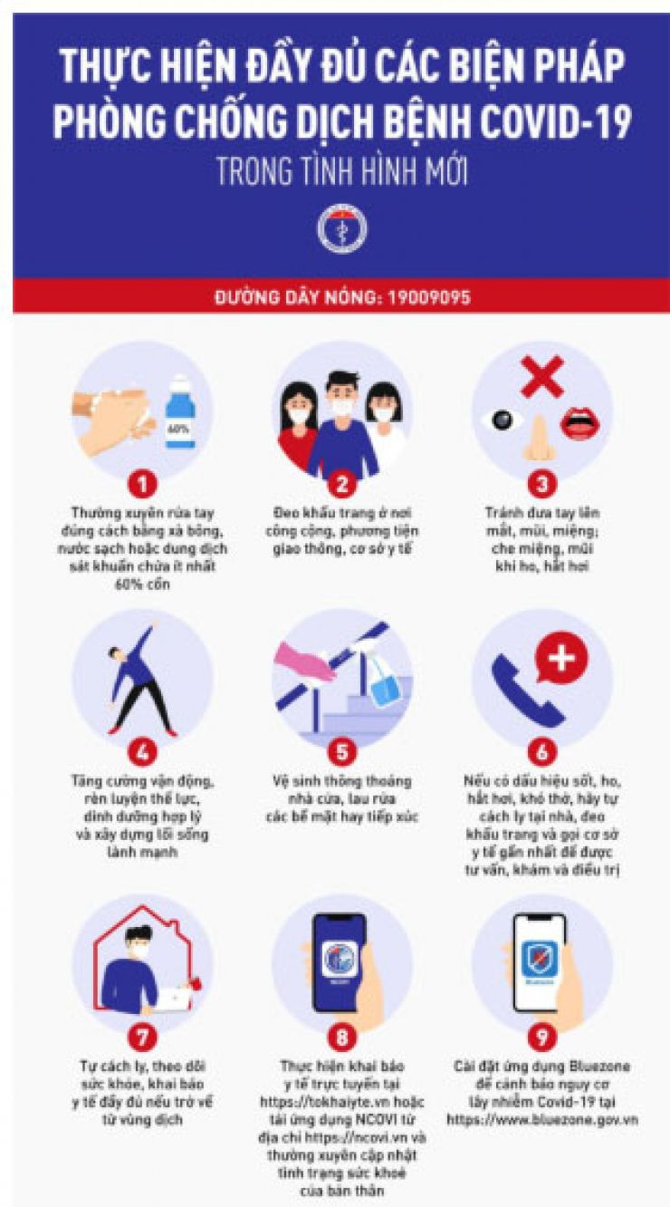 Bộ Y tế vừa đưa ra khuyến cáo mới nhất phòng chống dịch bệnh COVID-19 trong tình hình hình mới và đề nghị người dân thực hiện đầy đủ các biện pháp phòng chống dịch bệnh dưới đây: