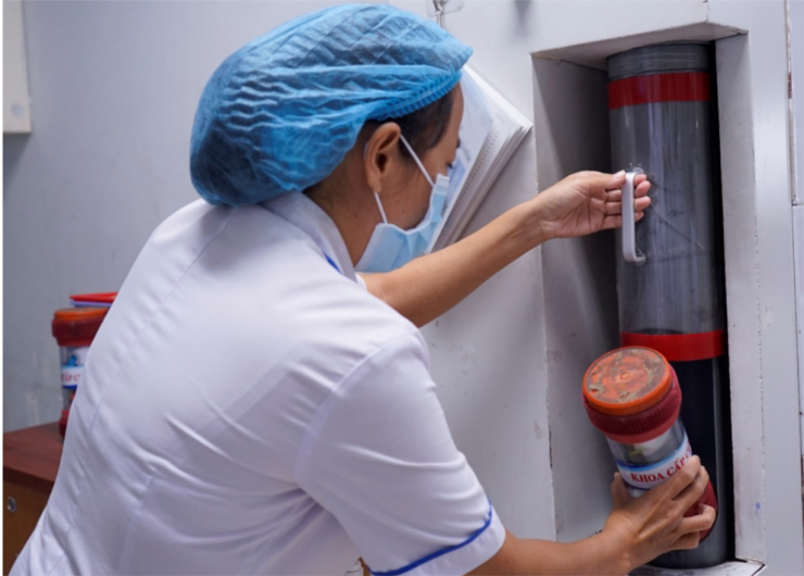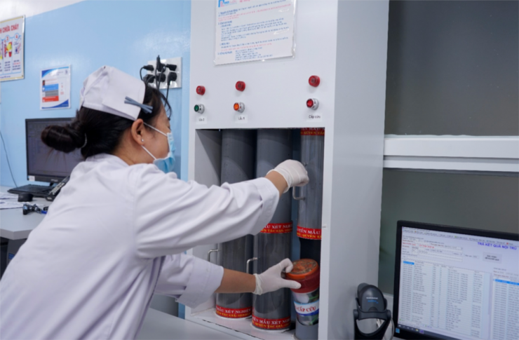 Điều dưỡng lấy và chuyển mẫu xét nghiệm qua hệ thống vận chuyển mẫu đến khoa Xét nghiệm