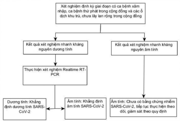 Hướng dẫn sử dụng sinh phẩm xét nghiệm nhanh kháng nguyên vi rút SARS-CoV-2 được Bộ Y tế cụ thể hoá theo 3 giai đoạn: (1) Giai đoạn có ca bệnh xâm nhập, ca bệnh thứ phát trong cộng đồng và các ổ dịch khu trú, chưa lây lan rộng trong cộng đồng; (2) Giai đoạn bệnh lây lan rộng trong cộng đồng; (3) Giai đoạn chỉ phát hiện ca mắc từ nước ngoài nhập cảnh, không có ca mắc trong cộng đồng. Tuỳ theo mỗi giai đoạn sẽ có phiên giải kết quả xét nghiệm nhanh kháng nguyên khác nhau.