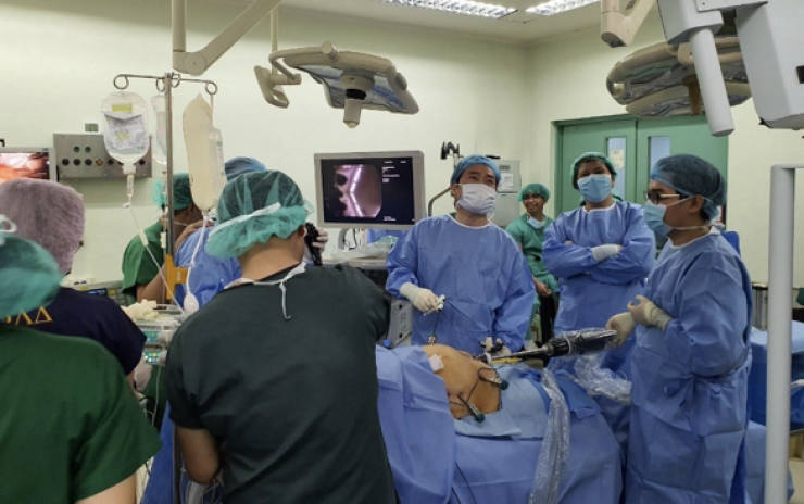 Các bác sĩ Philippines đang theo dõi bác sĩ Nguyễn Phú Hữu - Bệnh viện Bình Dân phẫu thuật robot trên người bệnh cân nặng 130 kg tại BV Philippine General Hospital