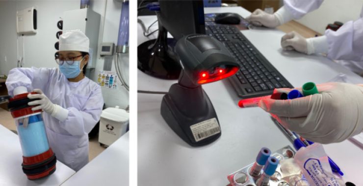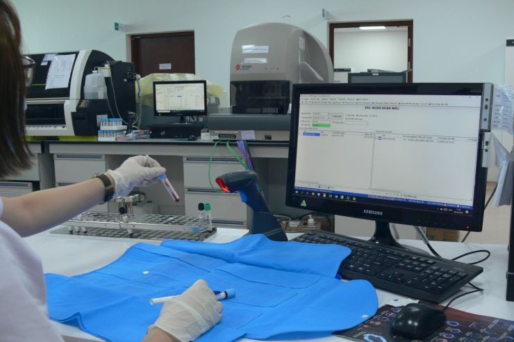 Nhân viên xét nghiệm tại “Khu tiếp nhận trung tâm” tiếp nhận mẫu bệnh phẩm từ khoa lâm sàng gửi đến, quét barcode đối chiếu chỉ định xét nghiệm của bác sĩ, chia sẽ mẫu và sắp xếp mẫu bệnh phẩm để tiếp tục gửi đến khoa xét nghiệm tương ứng