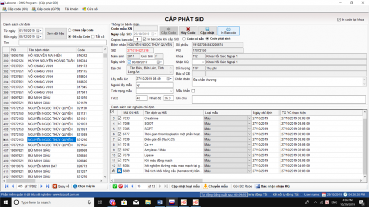 Mẫu bệnh phẩm được vận chuyển đến khoa xét nghiệm, quét barcode để xác nhận mẫu bệnh phẩm và xem thông tin chỉ định xét nghiệm (Khoa Xét nghiệm – BV Nhi đồng Thành phố, ngày 29/10/2019)