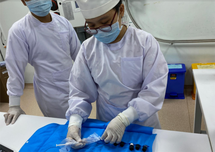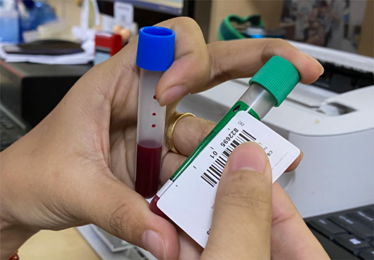 Điều dưỡng thực hiện lẫy mẫu xét nghiệm và dán code trên lọ đựng bệnh phẩm trước khi gửi đến khoa xét nghiệm