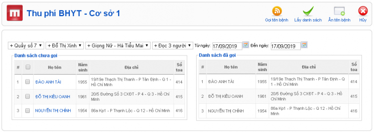 Giao diện ứng dụng gọi tên người bệnh của BV quận 1
