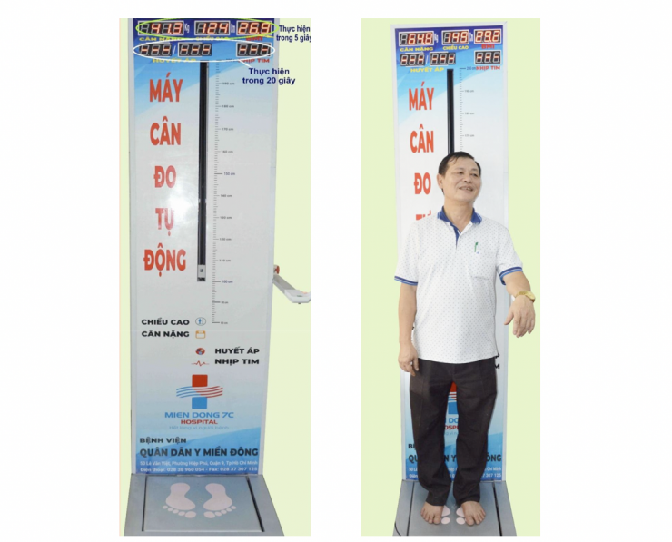 Sản phẩm ấn tượng thứ bảy là máy cân, đo tự động sử dụng các cảm biến đo cân nặng, cảm biến đo chiều cao, cảm biến đo nhịp tim, huyết áp. Các bước thực hiện cân đo thể lực bằng máy đo tự động: sử dụng mã barcode định danh trùng khớp với mã định danh được cấp do phần mềm khám sức khỏe định kỳ, người đo đứng thẳng để thiết bị kiểm tra chiều cao và cân nặng (mất 5s), thiết bị sẽ tự động tính chỉ số khối BMI, đặt tay trái lên thiết bị đo huyết áp và nhịp tim (mất 15-20 s). Kết quả được hiển thị trên bảng Led, lưu trữ vào trong bộ nhớ của thiết bị, dung lượng bộ nhớ của thiết bị có thể lưu trữ khoảng 1.000.000 kết quả. Đồng thời thiết bị gửi kết quả đo về máy tính một cách trực tiếp thông qua cổng kết nối serial. Chuyển kết quả đo thể lực trực tiếp vào phần mềm khám sức khỏe định kỳ.