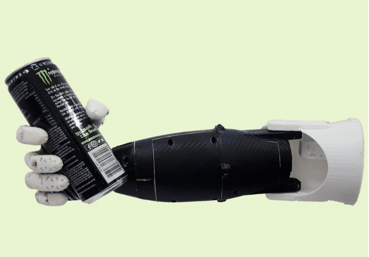 Sản phẩm ấn tượng thứ tư là cánh tay robot hỗ trợ người khuyết tật. Nhóm tác giả áp dụng công nghệ hiện đại và máy in 3D do chính bệnh viện lắp đặt thực hiện việc chế tạo cánh tay giả có khả năng chuyển động cầm nắm các vật dụng thông thường, chi phí thấp phù hợp với thu nhập của bệnh nhân. Nguyên tắc họat động của cánh tay giả là tiếp nhận các tín hiệu điện thế tế bào (EMG) từ các bó cơ của người bệnh, từ đó chuyển đổi thành tín hiệu số (digital) đến vi xử lý để điều khiển tập hợp các bộ phận chuyển động phức hợp của cánh tay, từ các khớp, gân, ngón tay, mô phỏng toàn bộ quá trình hoạt động của bàn tay người. Cánh tay giả hỗ trợ như cơ hội hồi sinh cho những người khuyết tật về tay. Nó giúp những người khuyết tật có thể hoạt động như những người bình thường. Họ có thể sinh hoạt một cách bình thường, tự phục vụ những nhu cầu cơ bản hằng ngày trong cuộc sống củng như tìm được công việc có mức thu nhập ổn định hơn, cải thiện cuộc sống không còn cảm thấy tự ti là gánh nặng của gia đình và xã hội. Từ đó, cuộc sống của họ trở nên dễ dàng hơn. Sản phẩm ra đời sẽ là một tin vui cho các bệnh nhân bị mất tay vì giờ đây với một số tiền cực thấp (~ 60.000.000 VNĐ) thay cho 100.000 USD (tương đương 2,3 tỷ VNĐ) người bệnh có thể sở hữu một cánh tay giả được thiết kế phù hợp với từng người bệnh qua đó chất lượng lượng cuộc sống của người bệnh được cải thiện, người bệnh hoàn toàn có thể sinh hoạt một cách bình thường, tự phục vụ những nhu cầu cơ bản trong sinh hoạt hằng ngày.