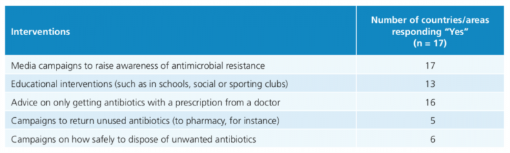 Có 17 quốc gia báo cáo đã triển khai các biện pháp để tăng cường sử dụng kháng sinh có trách nhiệm trong cộng đồng, ngoại lệ là Belarus. Bao gồm các chiến dịch truyền thông, các can thiệp giáo dục, khuyến cáo chỉ sử dụng kháng sinh theo đơn thuốc của bác sĩ, các chiến dịch trả lại và/hoặc tiêu huỷ an toàn các loại kháng sinh dư thừa.