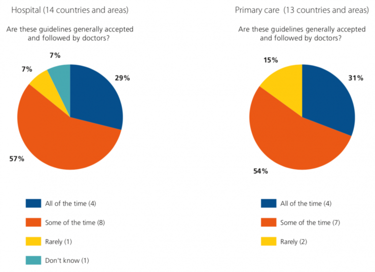 Hầu hết các quốc gia (14/18) báo cáo đã có phác đồ điều trị đối với một số bệnh nhiễm trùng thông thường tại bệnh viện và 13 nước báo cáo đã có hướng dẫn tại các cơ sở chăm sóc sức khỏe ban đầu. Nhưng việc sử dụng các phác đồ điều trị trong thực tế là ít rõ ràng. Chỉ khoảng 30% số người được hỏi cho rằng các hướng dẫn thường được chấp nhận và được các bác sĩ tuân thủ trong suốt thời gian thực hành khám chữa bệnh tại các bệnh viện và các cơ sở chăm sóc ban đầu.