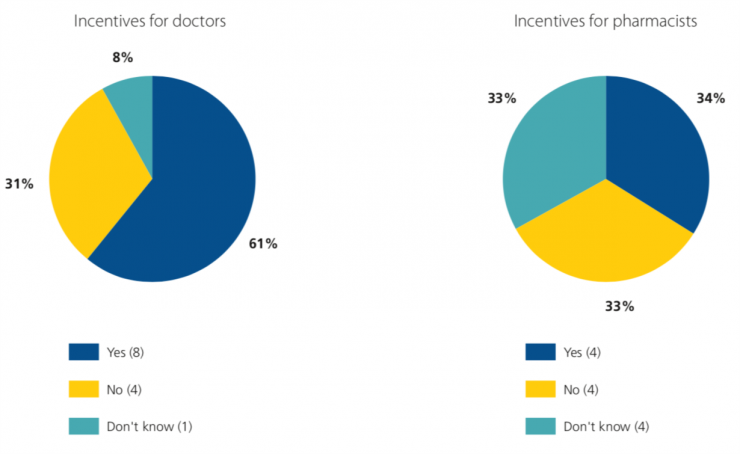 Tất cả các quốc gia báo cáo đã triển khai các biện pháp nhằm tăng cường sử dụng kháng sinh có trách nhiệm của bác sĩ. Bao gồm hoạt động đào tạo về kê đơn thuốc kháng sinh trong chương trình đào tạo y khoa đại học, chương trình đào tạo liên tục bắt buộc (CME) cho các bác sĩ phải bao gồm sử dụng kháng sinh thích hợp. 15 nước có tổ chức các sự kiện về sử dụng kháng sinh thích hợp cho các bác sĩ (ngoài CME), hầu hết các sự kiện (60%) được tài trợ của ngành công nghiệp dược phẩm hoặc nhà bán buôn.