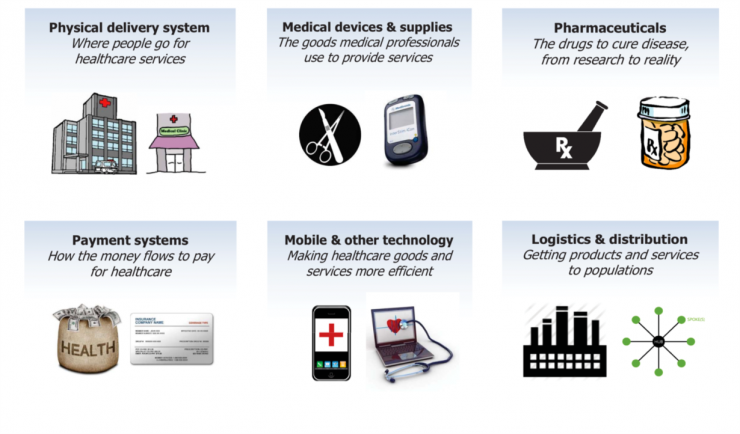 Tại một hội thảo khác tại Ấn Độ (2015) với chủ đề “Strengthening Health Systems in Developing Countries Through Private Investment” do Calvert Foundation, International Partnership for Innovative Healthcare Delivery, CASE, Investors' Circle phối hợp tổ chức, đã nêu ra 6 lĩnh vực y tế tại các nước đang phát triển mà các nhà đầu tư cần quan tâm là: (1) Hệ thống hạ tầng cung ứng dịch vụ chăm sóc sức khoẻ, (2) Dụng cụ y khoa, (3) Dược phẩm, (4) Hệ thống chi trả, (5) Công nghệ thông tin, (6) Hệ thống cung ứng dịch vụ logistics cho y tế.