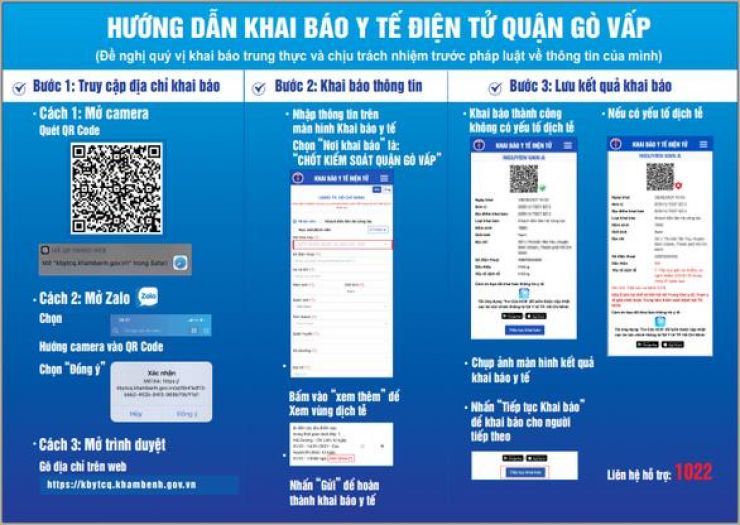 Người dân khai báo y tế điện tử trước khi ra, vào khu vực quận Gò Vấp và lưu tờ khai điện tử có mã QR được cấp trên điện thoại thông minh. Người dân nên chủ động khai báo y tế tại nhà trước khi di chuyển ra, vào quận Gò Vấp.