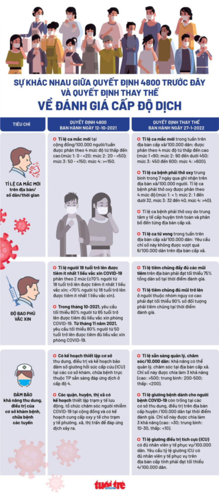 Bảng so sánh sự khác nhau giữa quyết định 4800 trước đây và quyết định thay thế ban hành ngày 27-1 của Bộ Y tế về đánh giá cấp độ dịch. Tổng hợp: XUÂN MAI. Đồ họa: NGỌC THÀNH