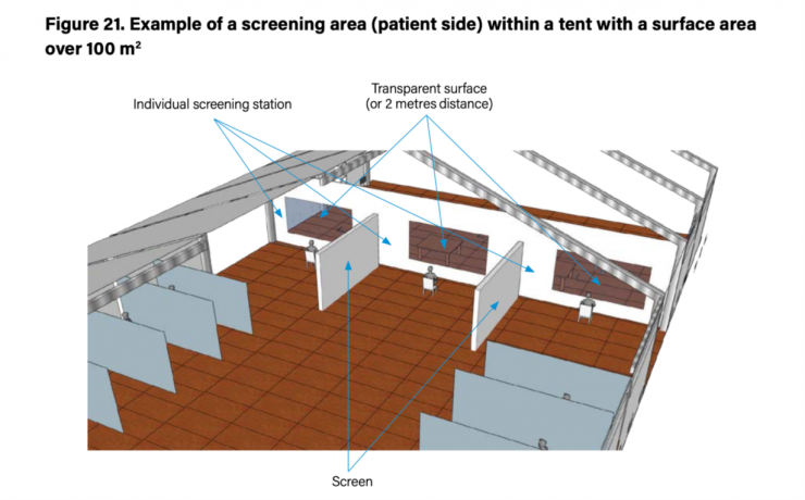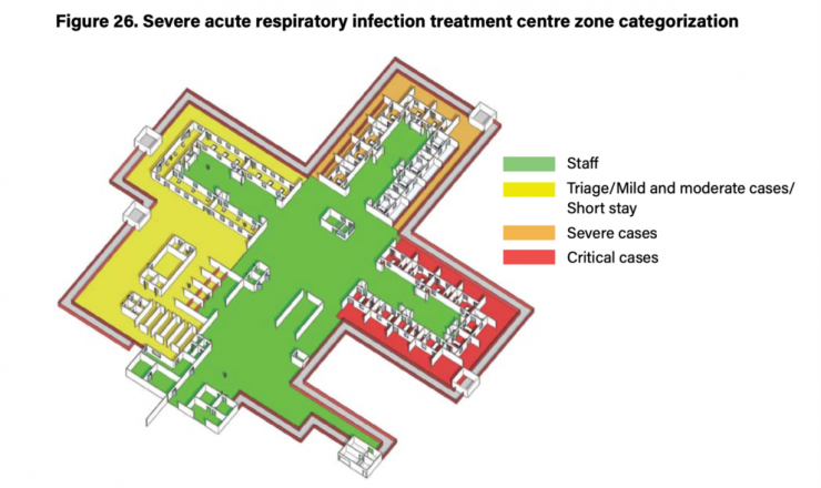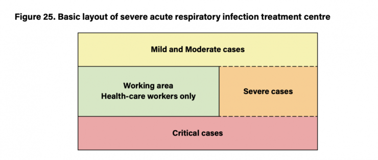 Tháng 3/2020, lần đầu tiên Tổ chức Y tế Thế giới đã phát hành tài liệu hướng dẫn thiết kế cơ sở hạ tầng chuyên điều trị các bệnh lý nhiễm trùng đường hô hấp cấp nặng (SARI: Severe Acute Respiratory Infections), với mục đích trước mắt là hướng dẫn thiết kế bệnh viện dã chiến điều trị COVID-19, tài liệu có tiêu đề là: “Severe Acute Respiratory Infections Treatment Centre - Practical manual to set up and manage a SARI treatment centre and a SARI screening facility in health care facilities”.