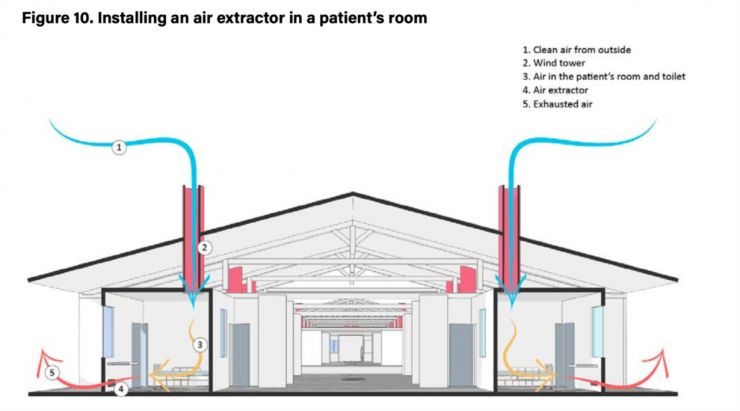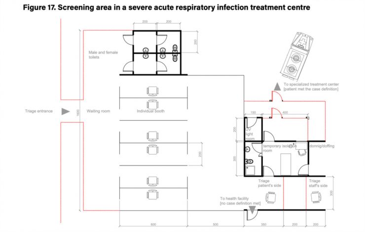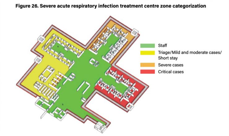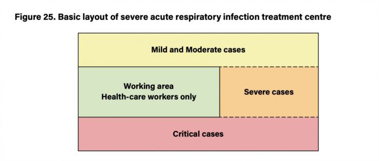 Tháng 3/2020, lần đầu tiên Tổ chức Y tế Thế giới đã phát hành tài liệu hướng dẫn thiết kế cơ sở hạ tầng chuyên điều trị các bệnh lý nhiễm trùng đường hô hấp cấp nặng (SARI: Severe Acute Respiratory Infections), với mục đích trước mắt là hướng dẫn thiết kế bệnh viện dã chiến điều trị COVID-19, tài liệu có tiêu đề là: “Severe Acute Respiratory Infections Treatment Centre - Practical manual to set up and manage a SARI treatment centre and a SARI screening facility in health care facilities”.