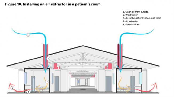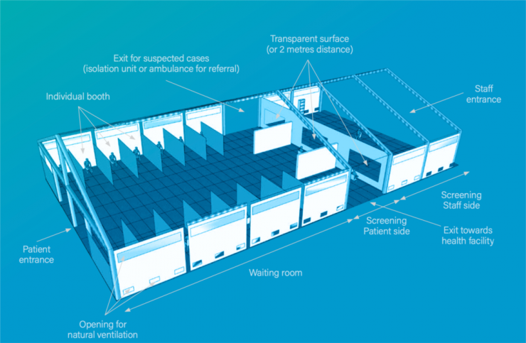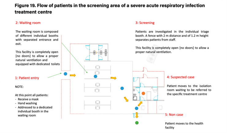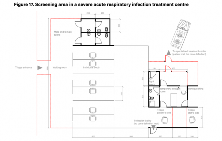 Tháng 3/2020, lần đầu tiên Tổ chức Y tế Thế giới đã phát hành tài liệu hướng dẫn thiết kế cơ sở hạ tầng chuyên điều trị các bệnh lý nhiễm trùng đường hô hấp cấp nặng (SARI: Severe Acute Respiratory Infections), với mục đích trước mắt là hướng dẫn thiết kế bệnh viện dã chiến điều trị COVID-19, tài liệu có tiêu đề là: “Severe Acute Respiratory Infections Treatment Centre - Practical manual to set up and manage a SARI treatment centre and a SARI screening facility in health care facilities”.