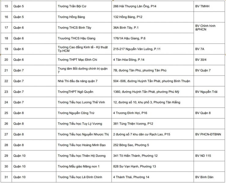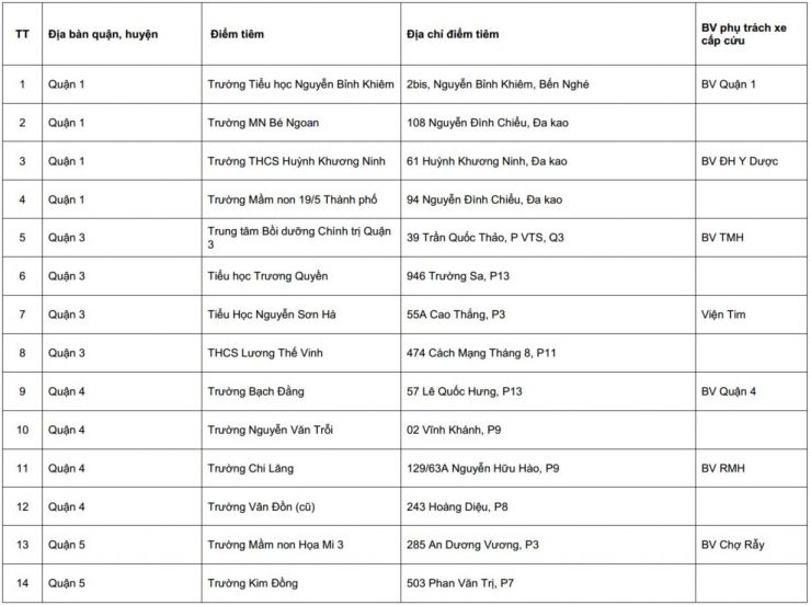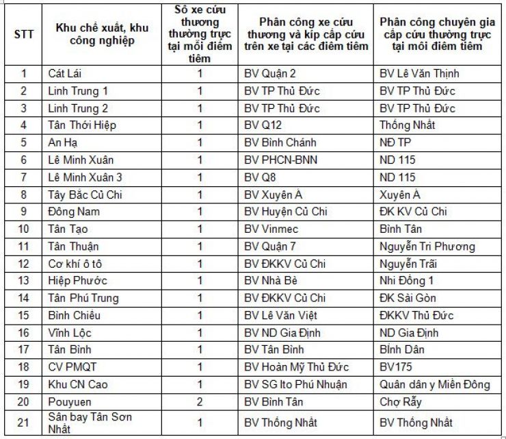 - Triển khai 21 tổ chuyên gia thường trực tại điểm tiêm theo công văn 3846/SYT-NVY (01 bác sĩ và 01 điều dưỡng chuyên về hồi sức cấp cứu kèm vali hồi sức cấp cứu). Nhiệm vụ chỉ huy chuyên môn cấp cứu tại chỗ, hỗ trợ xử trí cấp cứu nâng cao và chuyển viện.