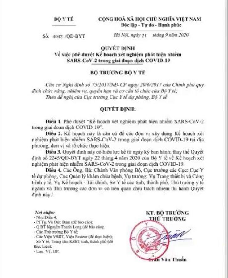 Ngày 21/9, Bộ Y tế đã ban hành Quyết định 4042/QĐ-BYT về việc phê duyệt Kế hoạch xét nghiệm phát hiện nhiễm SARS-CoV-2 trong giai đoạn dịch COVID-19.