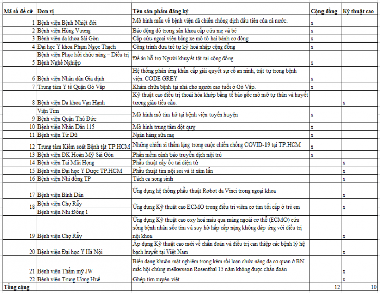 Dưới đây là danh sách 22 sản phẩm do hội đồng chuyên môn Sở Y tế chọn tham gia giải thưởng “Thành tựu Y khoa Việt Nam 2020”