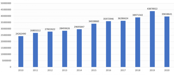 ố lượt khám bệnh tại các cơ sở KCB trên địa bàn thành phố (không tính BV Bộ, Ngành) từ năm 2010 – 2020