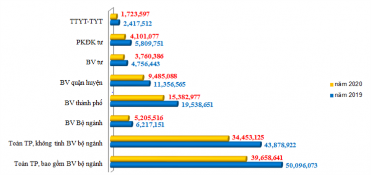 Tổng số lượt khám và điều trị ngoại trú trong năm 2020 giảm hơn 4,2 triệu lượt so với năm 2019, tương ứng giảm 20,8%, trong đó các bệnh viện thuộc Bộ, ngành giảm 16,3%, khối các bệnh viện Thành phố giảm 21,3%, khối các bệnh viện quận, huyện giảm 16,5%, khối trung tâm y tế và trạm y tế giảm 28,7%, khối các bệnh viện tư nhân giảm 20,9%, các phòng khám đa khoa tư nhân giảm 29,4%: