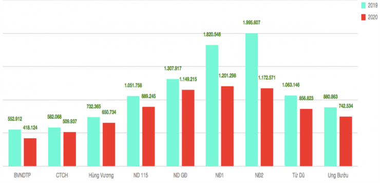 Tổng số lượt khám và điều trị nội trú trong năm 2020 giảm hơn 419 nghìn lượt so với năm 2019, tương ứng giảm 16,3%. Trong đó, các bệnh viện thuộc Bộ, ngành giảm nhiều nhất (19%), các bệnh viện trên địa bàn Thành phố không thuộc Bộ, ngành giảm 15,8%, trong đó, khối bệnh viện Thành phố giảm 18,8%, bệnh viện quận, huyện giảm 14,8%, bệnh viện tư giảm 4,5%: