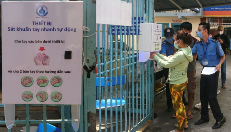 Máy sát khuẩn tay tự động được lắp đặt ngay cổng vào bệnh viện, người đến bệnh viện được đội bảo vệ giám sát và yêu cầu sát khuẩn tay
