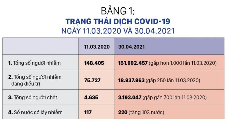 Nếu số người đang điều trị/1 triệu dân nhỏ hơn 10 thì có nghĩa nước đó có lây nhiễm Covid-19, song chưa có dịch. Còn nước có số người đang điều trị/1 triệu dân lớn hơn 10 thì có nghĩa là nước đó đang có dịch. Từ HÌNH 1 và BẢNG 1 ta thấy, sau ngày 11.03.2020, dịch Covid-19 trên toàn thế giới đang ngày gia tăng, đạt đỉnh của làn sóng thứ 1 ngày 24.01.2021, sau đó giảm, nhưng sau ngày 11.03.2021 lại tăng và ngày 30.04.2021 có mức lây nhiễm trong cộng đồng dân cư gấp 250 lần ngày 11.03.2020.