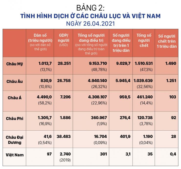 Đáng lưu ý là mức độ lây nhiễm và tỷ lệ chết vì Covid-19 của Việt Nam rất thấp. Trong khi bình quân trên 1 triệu dân ngày 26.04.2021 Việt Nam chỉ có 3,1 người nhiễm đang phải điều trị ở các bệnh viện thì ở Châu Mỹ là 9.029,7 người, gấp hơn 2.900 lần ở Việt Nam; ở Châu Âu là 5.945,4 người, gấp hơn 1.900 lần Việt Nam; ở Châu Á là 959,5 người, gấp hơn 300 lần Việt Nam, BẢNG 2.