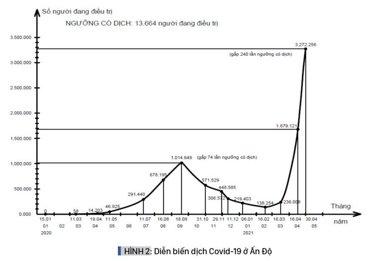 Ngày 16.02.2021, tức là sau 5 tháng từ khi làn sóng dịch thứ nhất đạt đỉnh (18.09.2020) số người đang được điều trị giảm còn 138.254, tức giảm 86% so với đỉnh dịch (1.014.649), số người đang được điều trị chưa bằng 14% lúc cao nhất. Đây là kết quả rất có ý nghĩa và chính lúc này, Chính phủ Ấn Độ đã nới lỏng hàng loạt biện pháp chống dịch: người dân được tham dự các lễ hội truyền thống, các cuộc mít tinh, vận động bầu cử, việc đeo khẩu trang bị lơ là. Chỉ trong vòng 2 tháng sau đó, Ấn Độ bùng phát dịch với mức độ chưa từng có, số người đang được điều trị tăng vọt từ 138.254 người lên 1.679.121 vào ngày 16.04.2021 và sau đó 2 tuần lên mức 3.272.256, HÌNH 2, gấp 240 lần ngưỡng có dịch. Số người chết từ 16.02.2021 đến 30.04.2021 là 55.890 người, nhiều hơn số người chết của hơn 7 tháng đầu năm 2020 (15.01.2020 – 20.08.2020) là 54.975 người.
