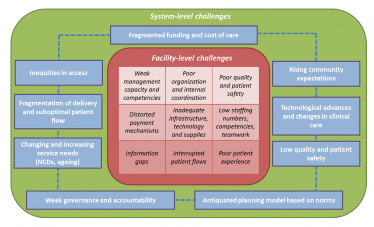 Những cải tiến trong hoạt động của bệnh viện là rất quan trọng để tiến tới bao phủ chăm sóc sức khoẻ toàn dân. Khi cơ sở y tế hoạt động tốt, hiệu suất tổng thể của hệ thống y tế được cải thiện. Ở cấp cơ sở là bệnh viện, đòi hỏi nhà quản lý bệnh viện phải chú ý đến các khía cạnh thể chế ảnh hưởng đến trách nhiệm, hiệu quả, chất lượng, công bằng và tính bền vững và khả năng phục hồi – đây cũng là 5 thuộc tính liên quan của một hệ thống y tế có hiệu suất cao.