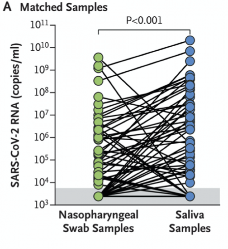 Sử dụng trình tự mồi (primer sequences) của Trung tâm Kiểm soát và Phòng ngừa bệnh tật, nhóm nghiên cứu đã phát hiện nhiều bản sao RNA SARS-CoV-2 trong mẫu nước bọt hơn so với trong mẫu tăm bông mũi họng (mean log copies per milliliter, 5.58; 95% confidence interval [CI], 5.09 to 6.07 của mẫu nước bọt; mean log copies per milliliter, 4.93; 95% CI, 4.53 to 5.33 của mẫu tăm bông mũi họng):