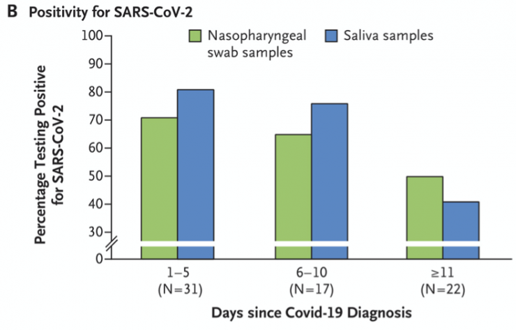Các mẫu nước bọt cho kết quả dương tính trong vòng 10 ngày sau khi đã chẩn đoán Covid-19 có tỷ lệ cao hơn so với các mẫu tăm bông mũi họng. Tại thời điểm 1 đến 5 ngày sau khi chẩn đoán, có 81% (95% CI, 71-96) mẫu nước bọt dương tính, so với 71% (95% CI, 67-94) của mẫu tăm bông mũi họng. Những phát hiện này cho thấy mẫu nước bọt và mẫu tăm bông mũi họng ít nhất có độ nhạy tương tự nhau trong việc phát hiện SARS-CoV-2 trong quá trình nhập viện: