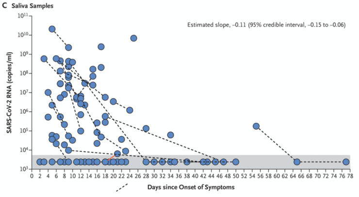 Đánh giá việc phát hiện vi rút trong các mẫu theo thời gian, mức độ của SARS-CoV-2 RNA giảm sau khi khởi phát triệu chứng ở cả hai mẫu nước bọt (độ dốc ước tính, −0,11; khoảng tin cậy 95%, −0,15 đến −0,06) và mẫu tăm bông mũi họng (độ dốc ước tính, −0,09; Khoảng tin cậy 95%, −0,13 đến −0,05):