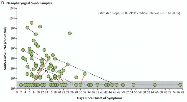 Có ba trường hợp mẫu tăm bông mũi họng âm tính được theo sau bởi dương tính ở lần lấy mẫu tiếp theo, hiện tượng này chỉ xảy ra một lần với các mẫu nước bọt.