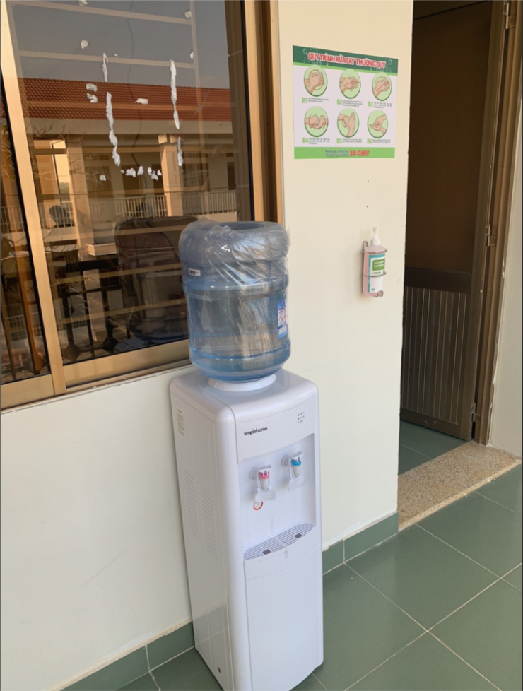Trước mỗi phòng cách ly đều có bình nước uống nóng, lạnh và bình dung dịch sát trùng tay nhanh