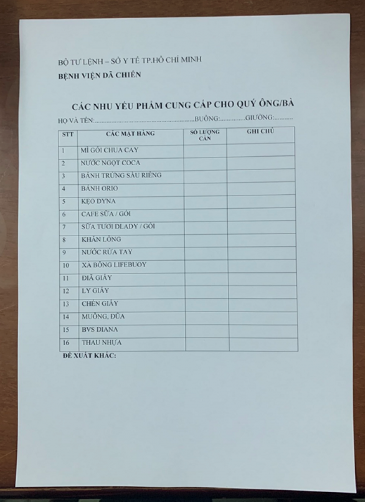Nếu có nhu cầu sử dụng các nhu yếu phẩm khác, người cách ly điều vào phiếu yêu cầu sẽ được cung cấp miễn phí trong thời gian lưu lại tại BV dã chiến