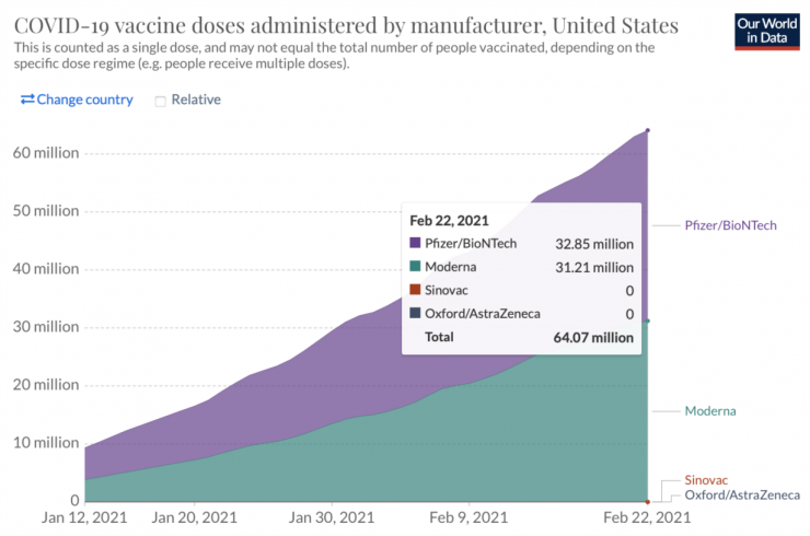 Vắc-xin của Pfizer/BioNTech có số lượt sử dụng cao nhất (32,85 triệu liều), kế đến là Moderna (31,21 triệu lượt):
