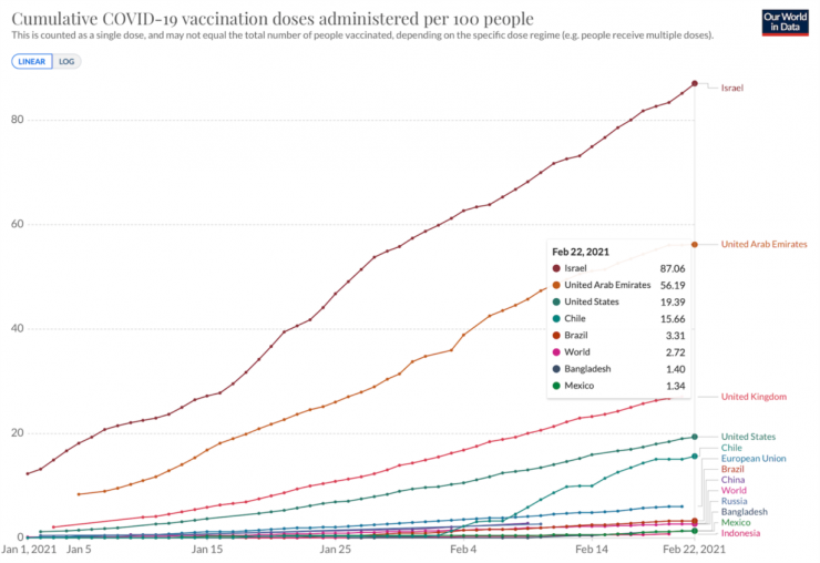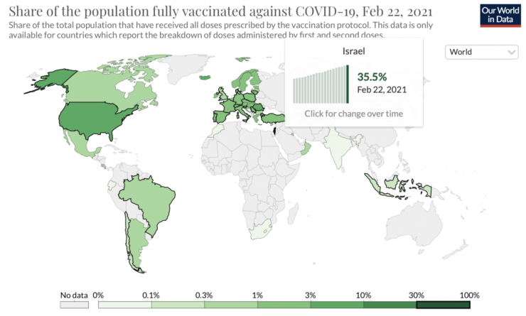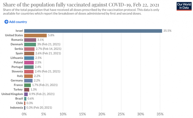 Quốc gia có tỷ lệ người dân đã được tiêm ít nhất 1 liều vắc-xin cao nhất là Israel (87.06%), kế đến là UAE (56,19%), Mỹ (19,39%), Chile (15,66%), Brazil (3,31%), Bangladesh (1,40%), Mexico (1,34%),… :