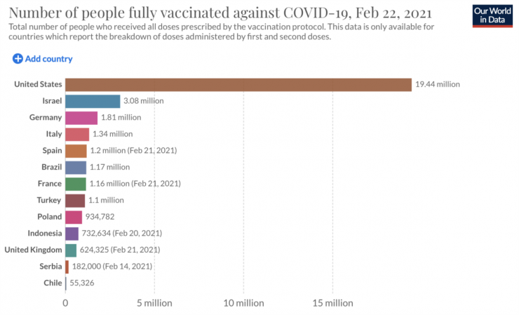 Dưới đây là những con số về tình hình tiêm vắc-xin SARS-CoV-2 trên toàn thế giới (tính đến ngày 22/02/2021):
