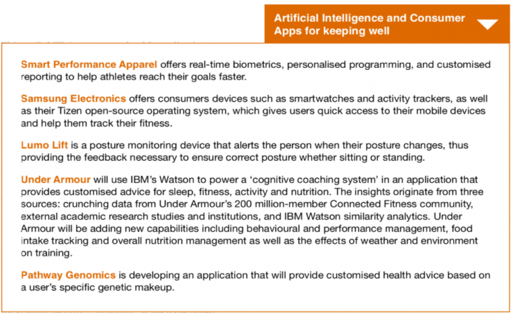 Các ứng dụng này và các ứng dụng khác đều khuyến khích các cá nhân và giúp quản lý một cách chủ động lối sống lành mạnh hơn. Ngoài ra, AI tăng khả năng cho các chuyên gia chăm sóc sức khỏe hiểu rõ hơn các mô hình và nhu cầu hàng ngày của những người họ chăm sóc và qua đó, họ có thể cung cấp phản hồi, hướng dẫn và hỗ trợ tốt hơn việc giữ sức khỏe.