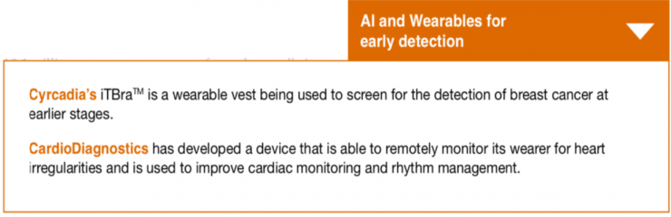 Sự phổ biến của thiết bị đeo tay người tiêu dùng và các thiết bị y tế khác kết hợp với AI cũng đang được áp dụng để giám sát bệnh tim mạch giai đoạn đầu, cho phép các bác sĩ và những người chăm sóc khác theo dõi tốt hơn và phát hiện các giai đoạn có khả năng đe dọa đến tính mạng ở giai đoạn sớm hơn, có thể điều trị được.