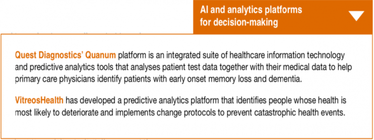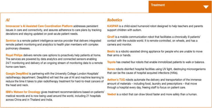Dưới đây là tóm lược các sản phẩm ứng dụng AI trong lĩnh vực chăm sóc sức khoẻ qua chuyên đề “ Why AI and robotics will define New Health” (PcW, 2017).