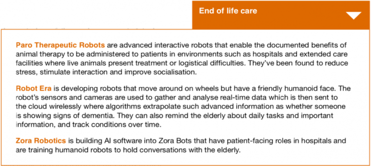 Robot có khả năng cách mạng hóa kết thúc chăm sóc cuộc sống, giúp mọi người duy trì sự độc lập lâu hơn, giảm nhu cầu nhập viện, người chăm sóc và nhà chăm sóc bằng cách thực hiện các công việc thường ngày như lấy dấu hiệu sinh tồn và nhắc nhở dùng thuốc. AI kết hợp với những tiến bộ trong thiết kế hình người đang cho phép robot tiến xa hơn và có các cuộc hội thoại và các tương tác xã hội khác giữ cho tâm trí già nua sắc bén và giải quyết các vấn đề về sự cô đơn. “Robot Kompai” nói chuyện, hiểu lời nói, nhắc nhở con người về các cuộc họp, theo dõi danh sách mua sắm và chơi nhạc. Được phát triển để hỗ trợ người già tại nhà riêng của họ, có thể theo dõi tình trạng té ngã và các thông số sức khỏe khác, đưa ra cảnh báo và kết nối qua hội nghị video với các nhà cung cấp dịch vụ chăm sóc sức khỏe cũng như với bạn bè và gia đình.
