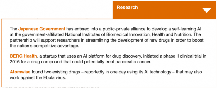 Nghiên cứu và khám phá thuốc là một trong những ứng dụng gần đây cho AI trong chăm sóc sức khỏe. Bằng cách chỉ đạo những tiến bộ mới nhất trong AI để hợp lý hóa quá trình phát hiện thuốc và tái sử dụng ma túy, có khả năng cắt giảm đáng kể cả thời gian để tiếp thị thuốc mới và chi phí của chúng, không chỉ cho các phòng thí nghiệm phát triển thuốc, mà còn cho những người có sức khỏe phụ thuộc vào họ. Pharma.AI là bộ phận Trí tuệ nhân tạo Dược phẩm của Insilico Medicine, một công ty tin sinh học tại Trung tâm Công nghệ mới nổi tại Đại học Johns Hopkins, ra mắt vào tháng 3 năm 2016. Họ tập trung vào các chương trình khám phá thuốc điều trị ung thư, Parkinson, Alzheimer và lão hóa khác và vấn đề sức khỏe liên quan đến tuổi.