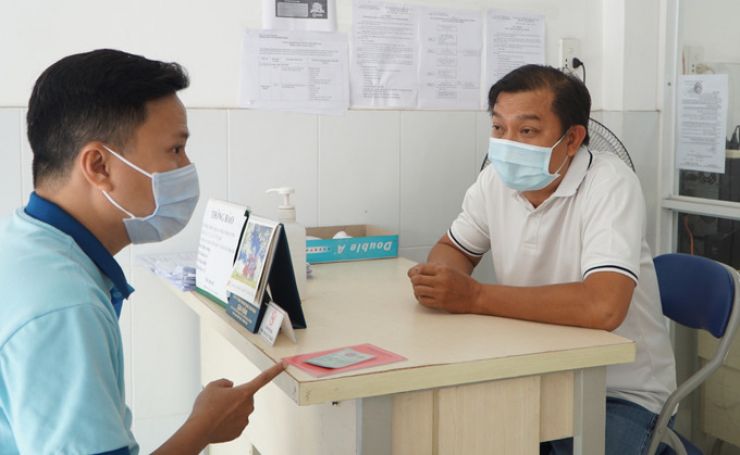 Anh Phú (bên phải) giải đáp thắc mắc khi người dân đến trạm y tế xin giấy chứng nhận "không đến từ vùng dịch" để về quê. Ảnh: Thư Anh.