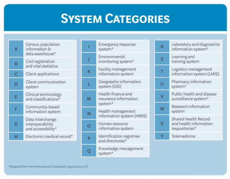 Việc phân loại các can thiệp kỹ thuật số trong lĩnh vực y tế - DHIs (Digital Health Interventions) sẽ giúp phân biệt sự khác nhau của các công nghệ kỹ thuật số và công nghệ di động đang được sử dụng để hỗ trợ các nhu cầu của hệ thống y tế. Hướng đến mục tiêu chủ yếu là sức khỏe cộng đồng, khung khân loại của TCYTTG phiên bản 1.0 (2018) nhằm mục đích thúc đẩy một ngôn ngữ bắc cầu cho các nhà hoạch định chương trình sức khoẻ để làm rõ các chức năng của việc triển khai sức khỏe kỹ thuật số, để đạt được các mục tiêu của ngành y tế.